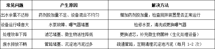 ①.定期檢查:每日查看設備運行狀態(tài),包括水泵、曝氣器、消毒模塊是否正常工作,儀表盤數(shù)據(jù)是否在標準范圍內(nèi);