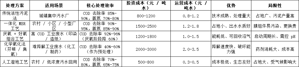 二、主流污水處理方案對比:按 “效果 - 成本” 選最優